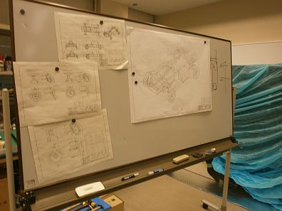 まず、サスペンション作動原理、足回り設定の仕方、ロールセンター、重量配分、車高設定、タイヤ選定、ダンパー作動原理等の講義を行いました。次に生徒さんたちが、作製したソーラーカーの足回りなどの製作図面の説明をして頂き、確認作業と講義、次にロールセンターのの求め方、足回りのアライメント調整の仕方について講義と実習を行い、一日目の講義を終えました。